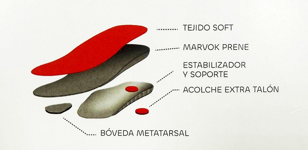 La plantilla incorpora una bóveda metatarsal para redistribuir la presión en metatarsos, amortiguación adicional en el talón para mejorar la absorción de impactos y el estabilizador que sujeta el puente. Fabricadaa con MARVOK-PRENE, material de alta densidad que asegura amortiguación y confort duradero. TOTAL SUPPORT es ideal tanto para uso diario como para actividades deportivas, ofreciendo durabilidad y  prevención de pataalogías menores derivadas del esfuerzo plantar.